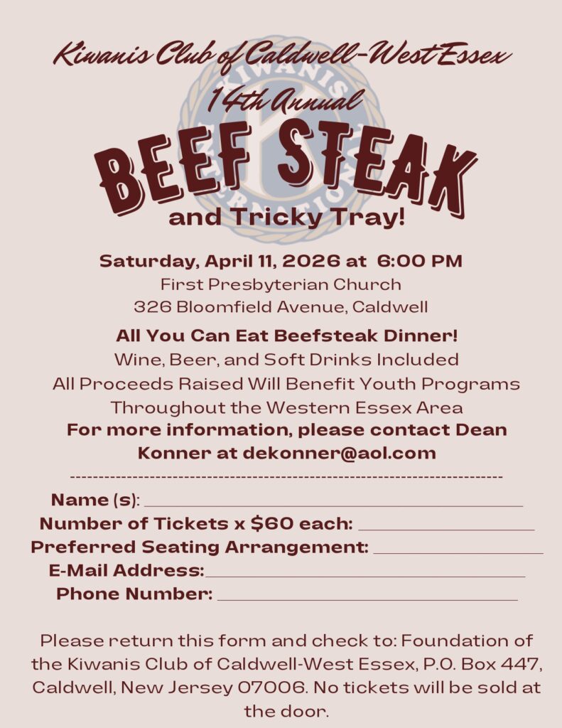 •Kiwanis Club of Caldwell-West Essex 14th Annual Beef Steak and Tricky Tray!