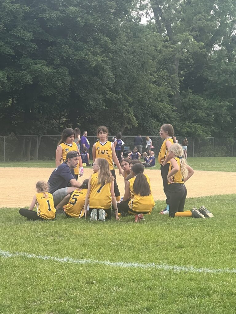 The Kiwanis Minors softball team takes instruction from Coach Phil.